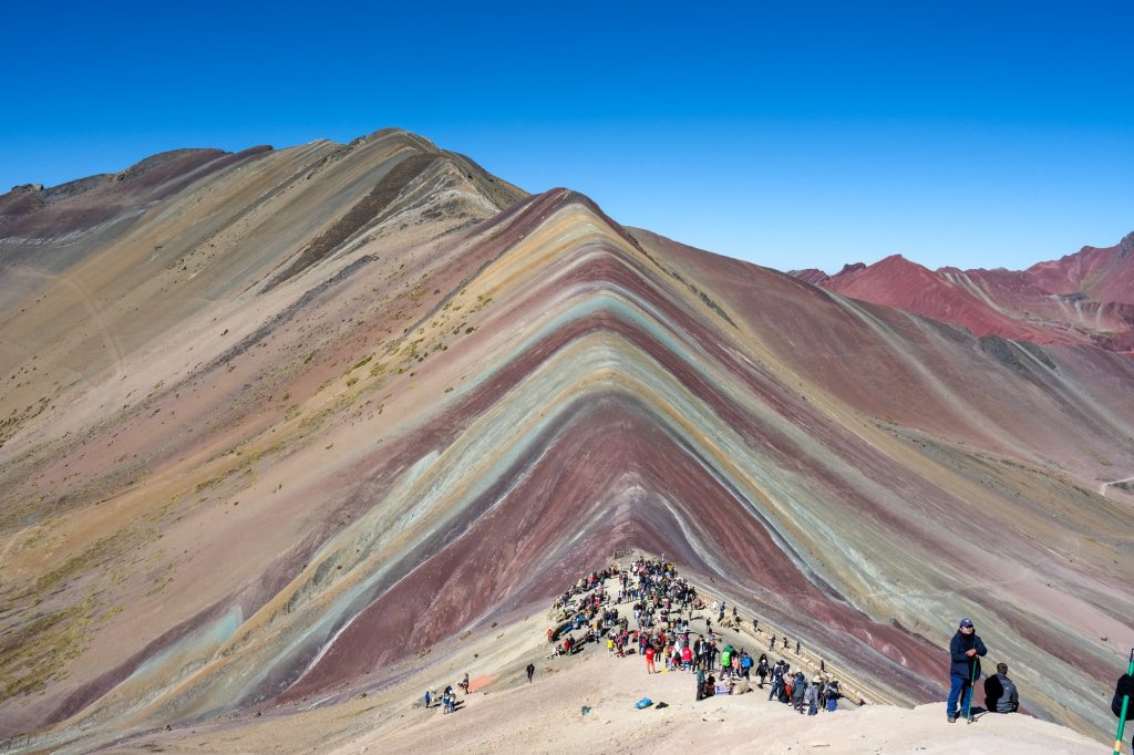 inhabitants of the area dressed in their typical costumes, who offer the horse rental service for those passengers who cannot walk or wish to enjoy the trip more relaxed, after a walk of approximately 1 hour 30 min. We will arrive at the famous mountain of seven colors also known as Vinicunca or Rainbow Mountain, a natural wonder of incomparable beauty that due to its capricious geography is unique in Peru, this geological formation is located at a height of 5,020 meters above sea level. You will have enough time to enjoy such a precious landscape and take spectacular photographs.
